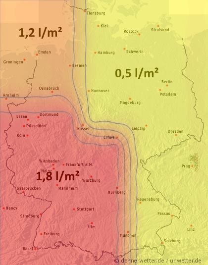 Am Montag zieht von Nordwesten gebietsweise etwas Regen, oder einige Schauer durch. Größere Niederschlagsmengen von 2 bis 6 Liter / m² fallen aber vermutlich nur im Süden und Osten der Republik und eventuell im Staubereich der Mittelgebirge. Anschließend wird es jedoch deutlich kühler.
