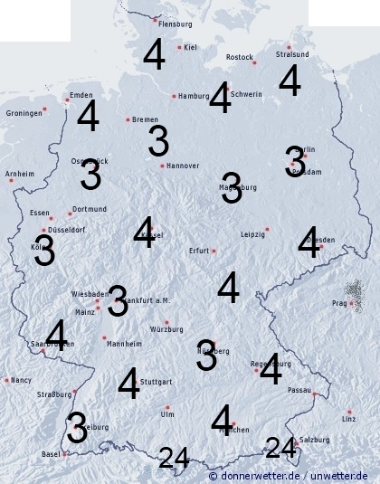 Vor allem im Norden kann es hin und wieder etwas tröpfeln oder nieseln, sonst bleibt es überwiegend niederschlagsfrei. Benetzung entsteht allerdings auch durch Feuchtigkeit wie Tauansatz. Die Benetzungsdauer liegt in Deutschland allgemein zwischen 2 und 5 Stunden, bei einer vorhandenen Schneedecke in den Bergen können bis 24 Stunden erreicht werden.