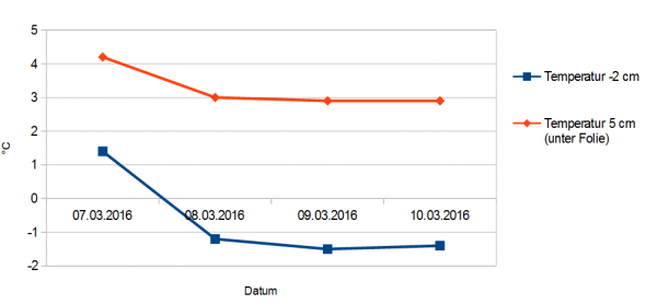 Unter Folien bleibt es nachts meist schon frostfrei, wie auch unsere aufgezeichneten Temperaturdaten der letzten vier Tage zeigen: