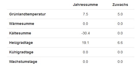 Damit Sie diese Berechnung nicht selbst von Hand durchführen müssen, übernimmt dies eines unserer Service-Tools automatisch für Sie. Sie müssen bloß noch Ihre Postleitzahl eingeben und schon erhalten Sie neben der Grünlandtemperatursumme auch die Wärme- und Kältesumme sowie die Heizgrad- , Kühlgrad- und Wachstumstage. Und das tagesaktuell und mit rückblickender Kalenderfunktion.