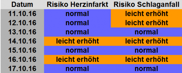 Herzinfarkt- und Schlaganfallrisiken in dieser Woche meist durchschnittlich.