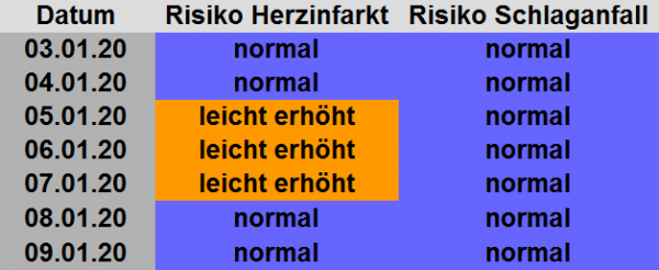 Vom Übergang zu milderem und wechselhafterem Wetter sind zum Wochenwechsel vor allem Herzinfarktgefährdete betroffen. Ansonsten bewegen sich die Risiken im unauffälligen Bereich.