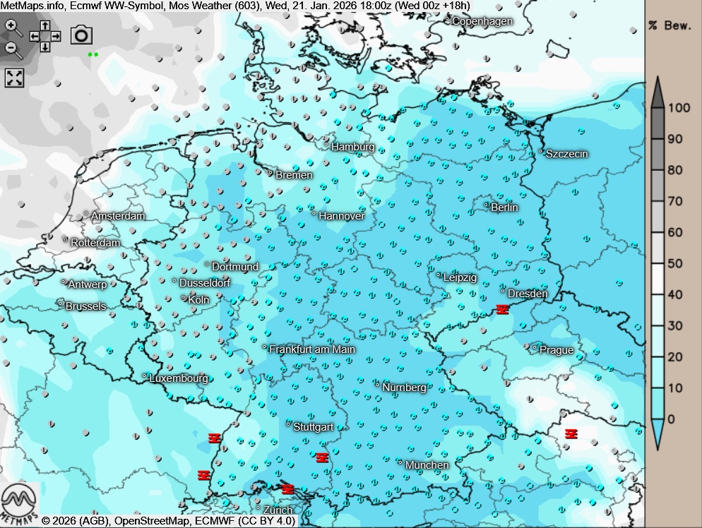 Große Temperaturunterschiede prägen den Mittwochabend: Während im äußersten Südosten mancherorts klirrende -10 Grad herrschen, liegen die Temperaturen am Niederrhein mit Werten um 6 Grad deutlich im Plusbereich.