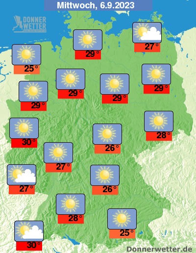Heute strahlt erneut verbreitet die Sonne und es ziehen kaum Wolken durch, dabei bleibt es trocken. Die Temperatur steigt auf 25 Grad im nördlichen Emsland und bis 30 Grad im Rheinland.