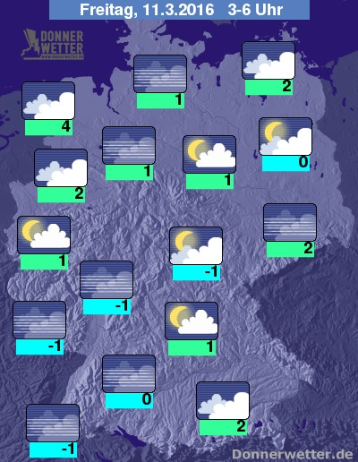 In der folgenden Nacht ziehen im Nordwesten Deutschlands sowie im Ostseeumfeld meist dichte Wolken durch, die jedoch keinen Regen bringen. Häufig stark bewölkt ist es auch über Thüringen und am Alpenrand, hier bleibt es zum Großteil trocken. Im übrigen Bundesgebiet ist es oft sternenklar, gebietsweise ziehen aber auch einige Wolken durch, dabei bleibt es trocken. Die Temperatur sinkt auf 4 Grad an der Nordsee und bis etwa -1 Grad im Saargau. Stellenweise bildet sich Nebel oder Hochnebel, dabei ist auch Rauhreif möglich!