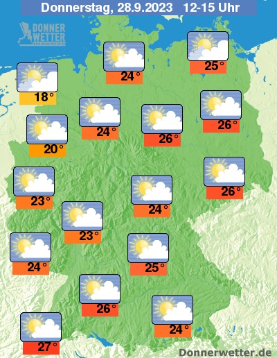 Heute Nachmittag zeigt sich das Wetter überwiegend heiter bis sonnig. Hier und da können aber auch mal mehr Wolken durchziehen, dabei bleibt es aber trocken. Die Temperatur liegt bei 18 Grad an der Nordseeküste und etwa 27 Grad im Oberrheingraben.
