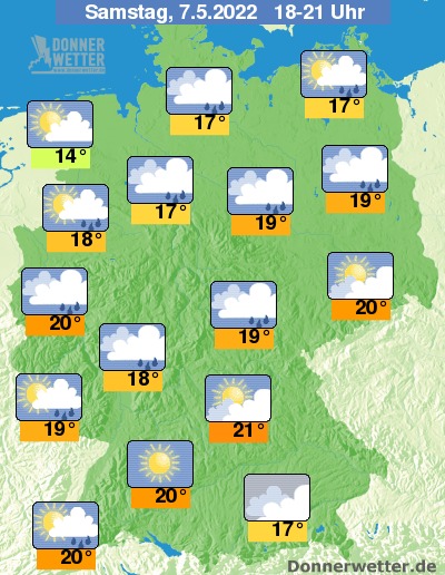 Heute Abend ist es über dem Land überwiegend stark und zum Teil aufgelockert bewölkt, dabei bilden sich gebietsweise Schauer, selten auch Gewitter. Im Süden ist es zwischendurch auch heiter bis sonnig und im Norden heitert es aus Nordwesten nach und nach auf, dann bleibt es hier trocken. Die Temperatur liegt bei 14 Grad in Cuxhaven und 21 Grad in Nürnberg.