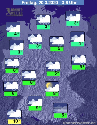 In der Nacht zum Freitag bleibt es lediglich im Süden noch meist gering bis aufgelockert bewölkt und trocken, sonst ziehen hingegen meist dichte Wolken durch und es fällt auch zeitweise Regen, zum Teil sogar Schneeregen. Die Temperatur sinkt auf 10 Grad in Freiburg und etwa 3 Grad in Hamburg.