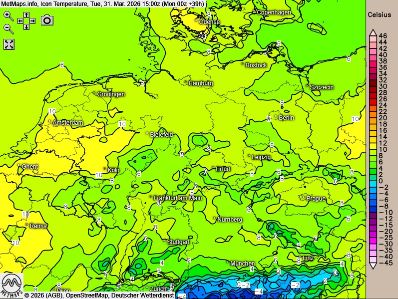 Die Temperaturen erreichen Höchstwerte um 2 Grad an den Alpen und um bis 12 Grad im Rheinland.