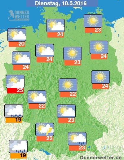 Am Dienstag ist es im Süden und Westen des Landes zum Teil aufgelockert, teils jedoch stark bewölkt, nach Südwesten hin sind dabei örtliche Schauer, vereinzelt auch Gewitter möglich, sonst bleibt es trocken. Im Norden und Osten ist es meist heiter oder sonnig und es bleibt weitgehend trocken. Die Temperatur steigt auf 19 Grad am Schwarzwald und bis auf sommerliche 25 Grad in der Kölner Bucht.