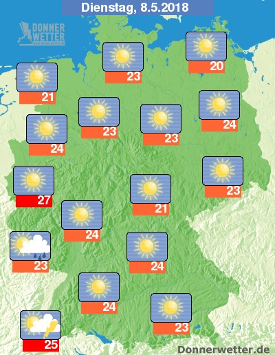 Zum Start in die Woche verwöhnt uns im gesamten Bundesgebiet die Sonne und es ist fast landesweit wolkenlos, dazu sind allenfalls an den Alpen ganz regional Schauer oder Gewitter möglich. Die Temperatur steigt auf 20 Grad in Emden und bis 27 Grad in Bonn.