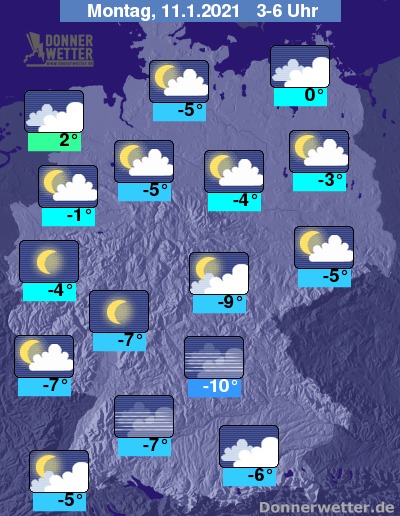 In der folgenden Nacht halten sich im Küstenumfeld meist dichte Wolken mit möglichen Tropfen, auch an den Alpen können dichte Wolken hierbei einzelne Flocken bringen. Im großen Rest des Landes ist es überwiegend locker bewölkt oder sternenklar, dazu bleibt es trocken. Die Temperatur sinkt auf 2 Grad in Wilhelmshaven und bis -10 Grad in Mittelfranken.