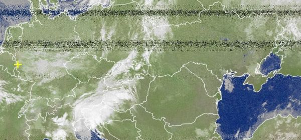Auf dem aktuelle Satbild sind dichte Wolken über Deutschland zu erkennen. Ein Regenband zieht über die Adria hinweg und über dem Schwarzen Meer ist es sonnig.
