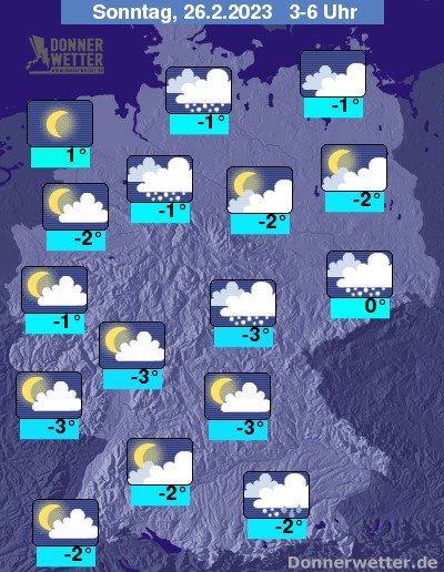 In der bevorstehenden Nacht bringen dichte Wolken über dem Südosten, Osten und auch teilweise im Norden möglichen Schneefall. Im übrigen Land ist es überwiegend gering bis wechselnd bewölkt und trocken. Die Temperatur sinkt auf 1 Grad in Cuxhaven und bis -3 Grad in Nürnberg.
