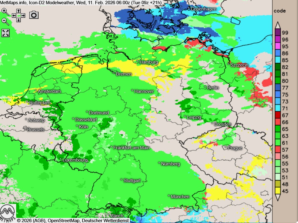Am Mittwoch zeigt sich der Himmel stark bewölkt oder es ist bedeckt. Dabei fällt vor allem im Südwesten teils anhaltender Regen, im äußersten Nordosten auch gefrierender Regen mit erheblicher Glättegefahr! Es weht ein starker bis stürmischer Wind, auf den Gipfeln auch Sturmböen.