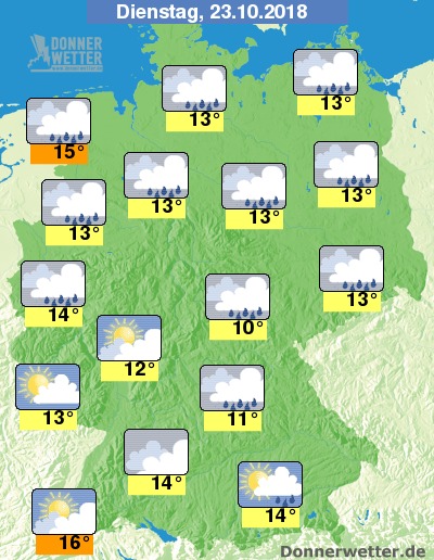 Von der Mosel und dem Rhein-Main-Gebiet bis zum Bodensee ist es teils heiter teils bewölkt und trocken. Sonst dominieren meistens kompakte Wolken und häufig fällt Regen oder Sprühregen, im Nordosten auch mal kräftiger. Die Höchsttemperaturen liegen bei herbstlichen 10 bis 16 Grad. Am wärmsten wird es im Emsland und im Breisgau.
