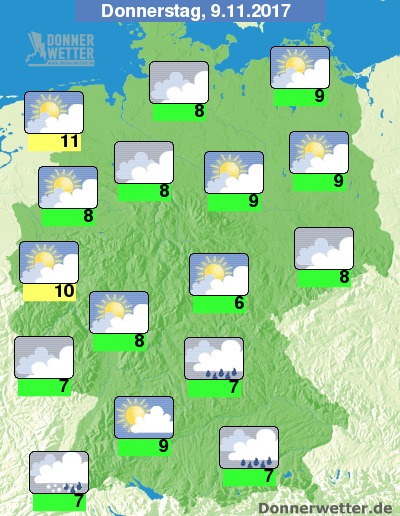 Am Donnerstag zieht zum Teil starke, teils lockere bis aufgelockerte Bewölkung durch, dabei fällt im Süden gebietsweise Regen, im übrigen Bundesgebiet bleibt es jedoch weitgehend trocken. Die Temperatur steigt auf 6 Grad im Grabfeld und bis 11 Grad in Emden.
