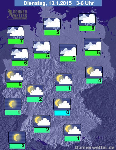 In der kommenden Nacht ist es in der Südhälfte des Landes verbreitet aufgelockert, gebietsweise auch nur leicht bewölkt, im Südwesten ist es örtlich sogar sternenklar, dazu bleibt es trocken. Im Norden und Nordwesten ziehen hingegen dichte Wolken durch und es fällt zum Teil kräftiger Regen. Die Temperatur sinkt auf 7 Grad in Bremen und bis 0 Grad in Niederbayern. In der Nordhälfte des Landes weht ein frischer bis starker und in Böen stürmischer Wind. An der See und auf den Hochlagen der Norddeutschen Mittelgebirge ist es teils stürmisch mit möglichen Sturmböen.