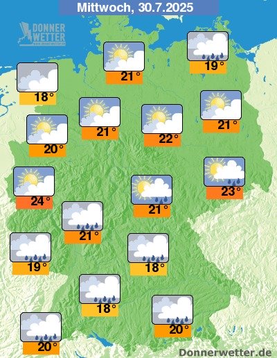 Am Mittwoch ist es über dem Norden meist stark bewölkt oder bedeckt und es bilden sich oft Schauer. Im übrigen Bundesgebiet ist es zum Teil heiter, teils ziehen jedoch ebenfalls dichte Wolken durch, dabei bilden sich gebietsweise Schauer. Die Temperatur erreicht 18 Grad in Wilhelmshaven und bis 24 Grad in Bonn.