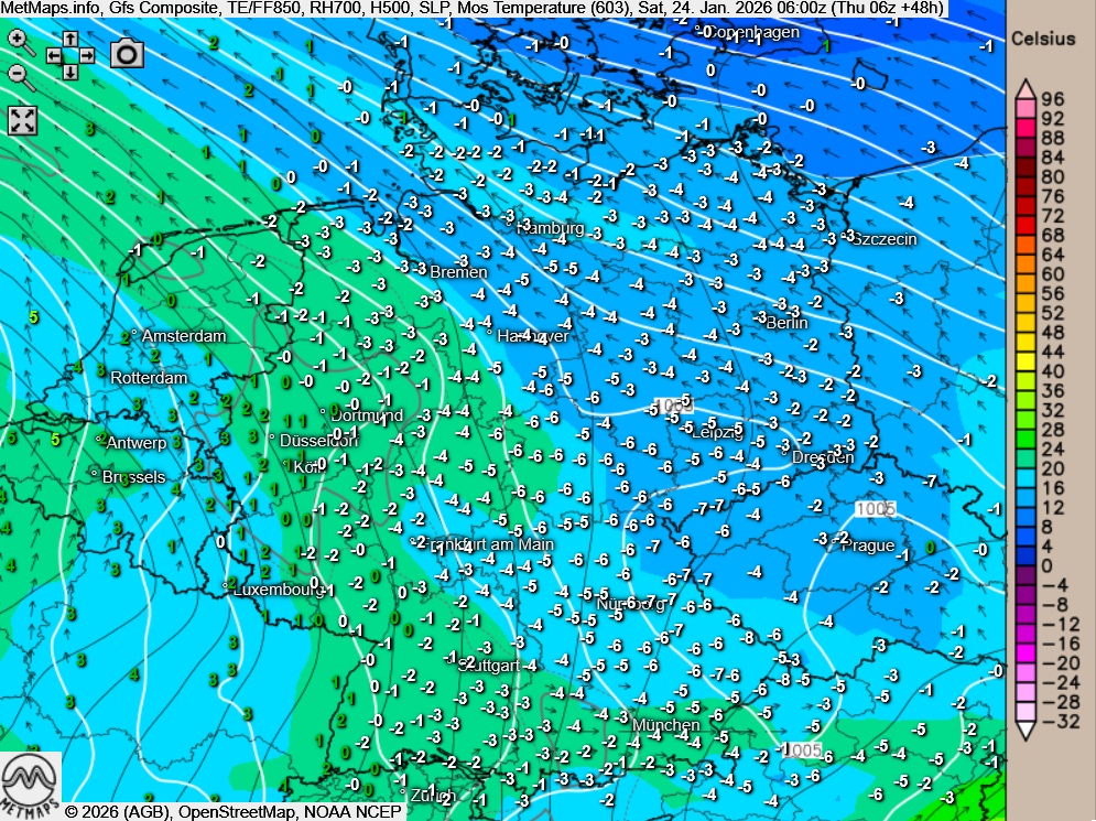 Die Wetter- sowie die Strömungs- / Temperaturkarte für Samstagfrüh (06:00 Uhr) sowie die 24-Stunden-Schneemengen für Samstag nach GFS: