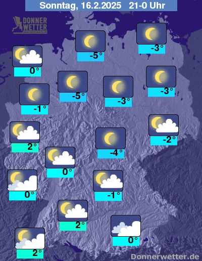 In der Nacht zum Montag bleibt der Himmel über den Alpen wolkig oder es ist stark bewölkt. Sonst zeigt sich der Himmel sternenklar oder nur gering bewölkt; in den frühen Morgenstunden nimmt die Bewölkung im Westen und Südwesten zu. Es bleibt trocken.