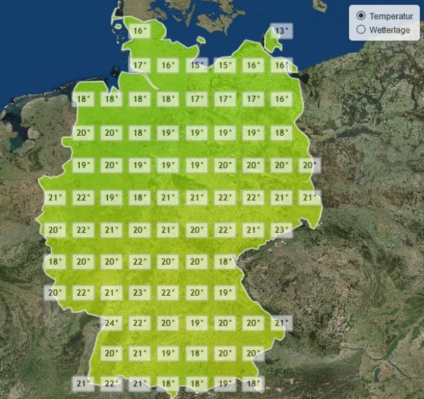 Dabei fallen die Temperaturen bis zum frühen Morgen auf Werte um die 10 Grad in weiten Teilen Bayerns und auf rund 15 Grad am Niederrhein.