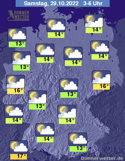 In der folgenden Nacht zeigt sich der Himmel locker bis aufgelockert, teilweise jedoch auch stark bewölkt. Es bleibt trocken bei Tiefstwerten von 17 Grad in Freiburg und 13 Grad in Meppen.
