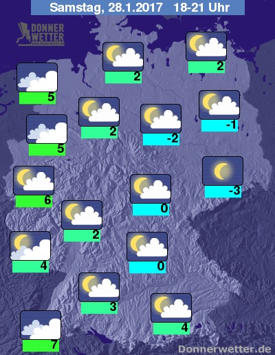 In der Nacht zum Sonntag klart der Himmel über der Osthälfte der Republik meist auf oder es ziehen nur lockere Wolkenfelder durch. Mehr und zum Teil auch dichte Wolken halten sich vom Emsland bis zum Nieder- und Mittelrhein. In den übrigen Landesteilen ist es meist locker bis wechselnd bewölkt. Es bleibt bundesweit trocken bei Tiefstwerten von 2 Grad in Emden und bis -6 Grad in Oberfranken.