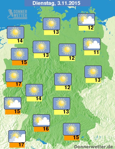 Heute scheint nach Auflösung örtlicher Nebel- und Hochnebelfelder verbreitet die Sonne. Im Nordosten ziehen noch einige, weitgehend lockere Wolken durch. Im Tagesverlauf ziehen aus Südwesten zunächst lockere, später im Südwesten auch teils dichte Wolken auf, es bleibt jedoch landesweit trocken. Die Temperatur steigt auf 11 Grad im nördlichen Brandenburg und bis 17 Grad im Rheinland.