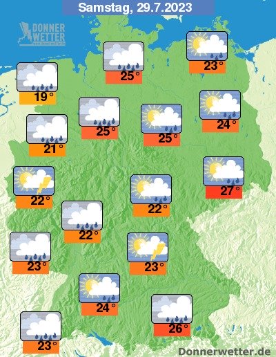 Am Samstag ist es verbreitet aufgelockert bis stark bewölkt, dabei bilden sich zeitweise Schauer, örtlich können sich auch Gewitter entwickeln. Die Temperatur steigt auf 19 Grad an der Nordsee und bis 27 Grad an der Neiße.