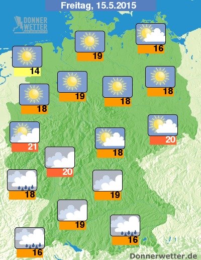Am Freitag halten sich im Süden und Südwesten weiterhin dichte Wolken und es fällt oft kräftiger und teils langanhaltender Regen. Im Südwesten klingt der Regen ab den Nachmittagsstunden jedoch ab und gegen Abend lässt der Regen auch im Süden immer weiter nach. In der Nordhälfte des Landes ist es dagegen verbreitet heiter oder sonnig. Im übrigen Bundesgebiet zieht aufgelockerte oder starke Bewölkung durch, dabei bleibt es trocken. Die Temperatur steigt auf 14 Grad an der Nordsee und bis 21 Grad in Köln.