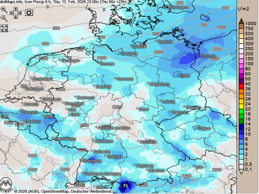 Am Donnerstagnachmittag bleibt der Himmel über den meisten Landesteilen stark bewölkt oder es ist bedeckt, dabei fällt vor allem in den Staulagen der Mittelgebirge teils ergiebiger Regen, im äußersten Norden und Nordosten auch Schnee. Es ist windig bis stürmisch, in den Höhenlagen auch Sturm oder schwerer Sturm.