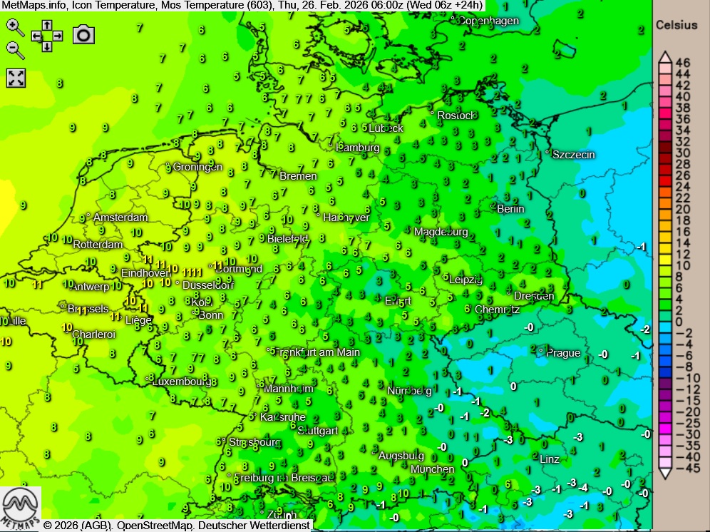 Die Wetter- und Temperaturkarte für Donnerstagfrüh (06:00 Uhr) nach ICON: