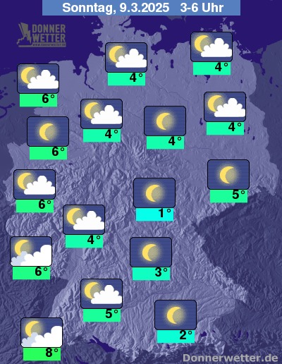 Die Temperaturen gehen in den frühen Morgenstunden zurück auf Werte um 8 bis 6 Grad entlang des Rheins und 1 Grad im Thüringer Becken.