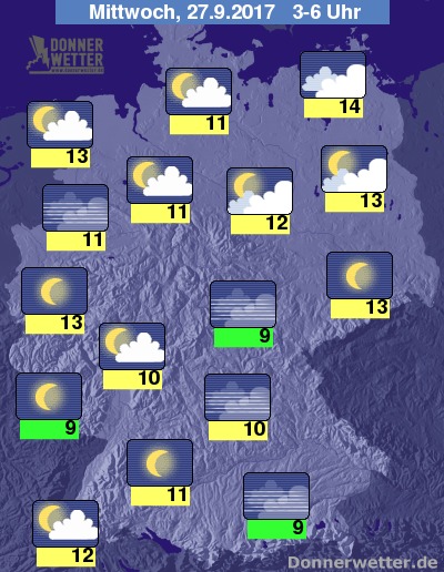 In der Nacht zum Mittwoch bleibt es im Nordosten oft stark, teils aufgelockert bewölkt, sonst zeigt sich der Himmel meist nur locker bewölkt, häufig sogar sternenklar. Es bleibt trocken bei Tiefstwerten von 13 Grad an der Nordsee und bis 9 Grad in Mittelfranken.