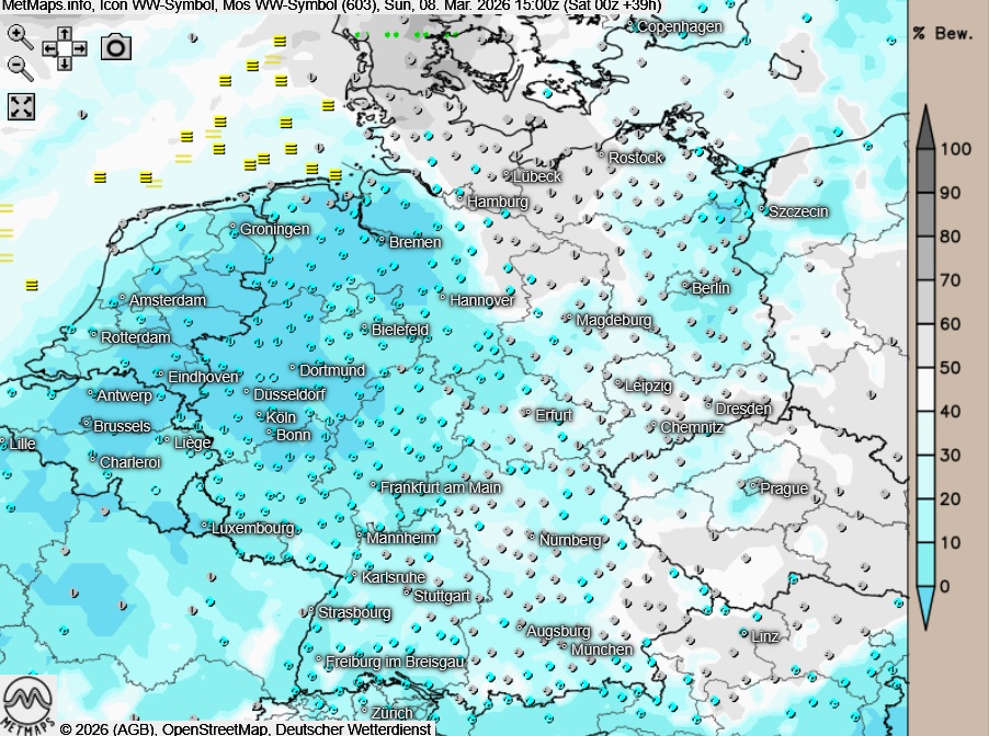 Am Sonntagnachmittag zeigt sich der Himmel über dem Norden und Nordosten teils dicht bewölkt, dabei kann vor allem in Ostseenähe etwas Niederschlags fallen. Über den Osten ziehen am Nachmittag verbreitet hohe und mittelhohe Wolkenfelder hinweg, es bleibt aber trocken. Sonst zeigen sich die nächsten Stunden vielfach sonnig mit Eintrübung durch Saharastaub.