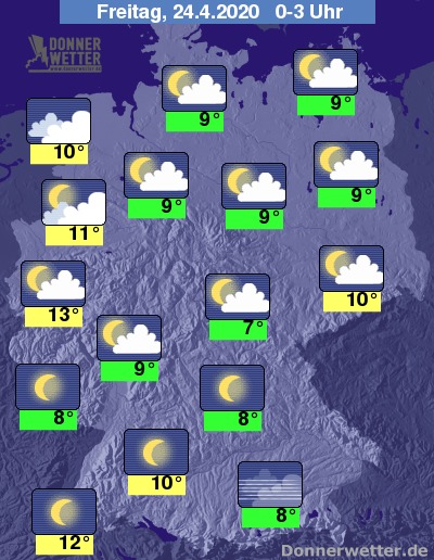 Während der Nacht ziehen über den Norden Wolkenfelder hinweg, Regen fällt daraus aber nicht. In der Südhälfte bleibt es überwiegend sternenklar oder nur leicht bewölkt. Speziell an den Bayerischen Gewässern können sich stellenweise Nebelfelder bilden.