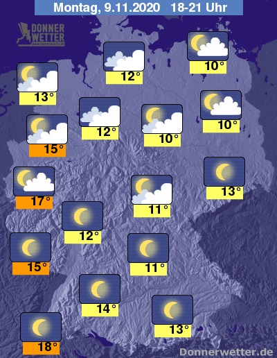 In den Abendstunden wird die Nordhälfte Deutschlands weiterhin von wechselnder oder starker Bewölkung dominiert. Im Süden , Südosten und später auch im Westen bleibt der Himmel dagegen weitgehend wolkenfrei.