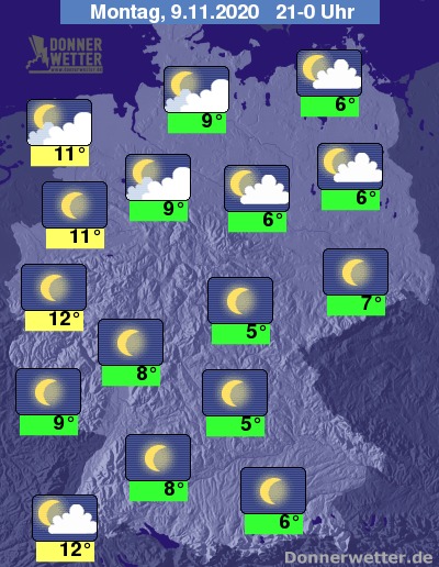 Die Temperaturen gehen in den späten Abendstunden auf Werte um 12 Grad in Bonn und 5 Grad in Franken zurück.