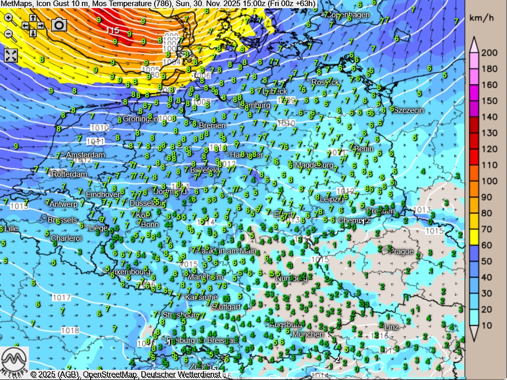 Die Böen- / Temperatur- sowie die Wetterkarte für Sonntagnachmittag (15:00 Uhr) nach ICON: