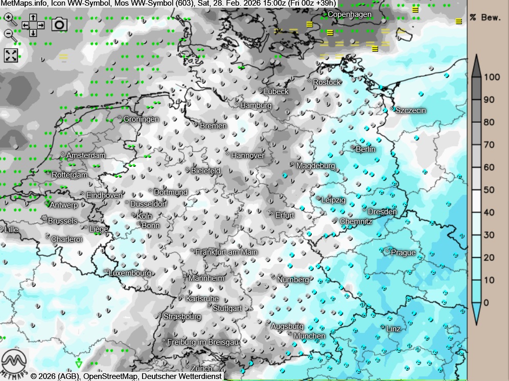 Am Samstagnachmittag zeigt sich der Himmel über dem Westen und Nordwesten wolkig oder es ist stark bewölkt, dabei kann zeit- und gebietsweise noch etwas Regen fallen. In Auch südlich der Donau in Richtung Abend lokal etwas Niederschlag. Sonst ist es am Nachmittag heiter, im Osten und Südosten auch sonnig, und es bleibt trocken.