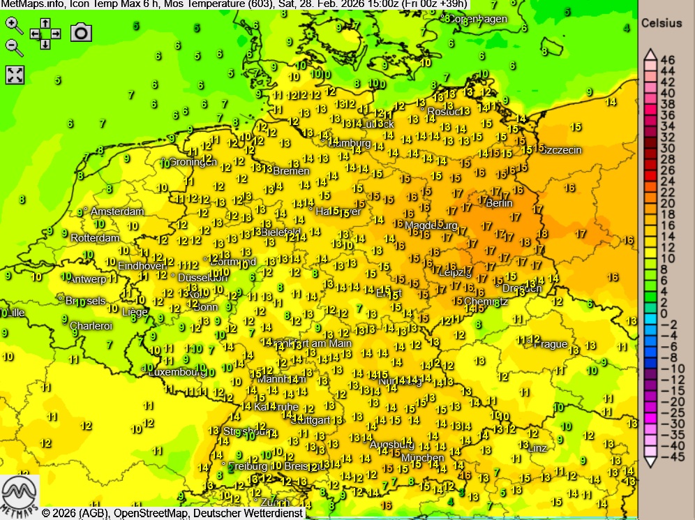 Die Sechs-Stunden-Maximaltemperaturen am Samstagnachmittag sowie die Wetterkarte (15:00 Uhr) nach ICON:
