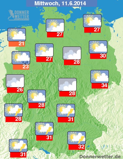 Heute nur an der Nordsee ist es schon teils frisch, vor allem im Süden und Osten schwülheiß mit hohem Gewitterrisiko bei Werten bis 35 Grad C.