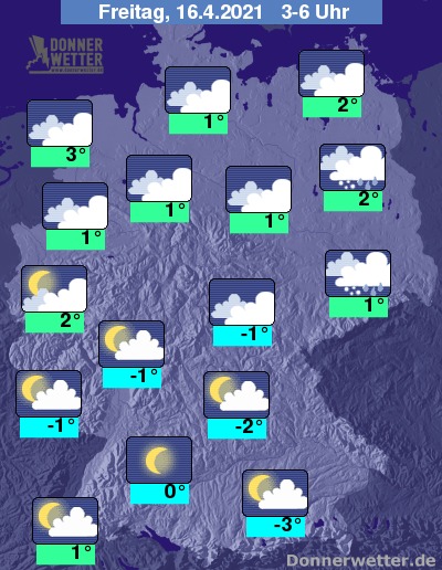 In der Nacht zum Freitag setzt im Osten bei dichten Wolken zeitweise Regen oder Schneefall ein. Auch im übrigen Osten, Nordosten und Norden bleibt es weitgehend dicht bewölkt, jedoch auch weitgehend trocken. Oft aufgelockert bewölkt ist es im Westen und im Süden ist es sogar meist nur gering bewölkt oder sternenklar, dazu bleibt es trocken. Die Temperatur sinkt auf 3 Grad an der Nordseeküste und bis -3 Grad in Oberbayern.