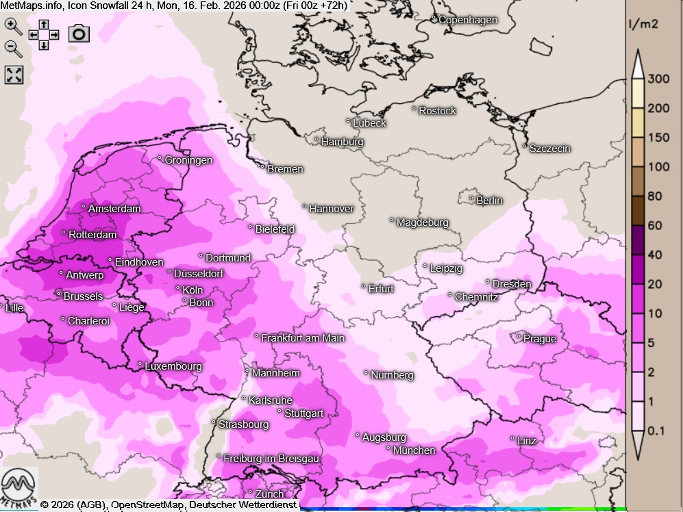 Die Wetter- / Temperaturkarte für Sonntagfrüh (06:00 Uhr) sowie die 24-Stunden-Schneemengen am Sonntag nach ICON: