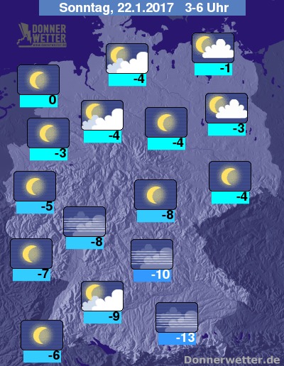 Die Temperaturen liegen am Sonntagmorgen bei Werten um -14 Grad C am Alpenrand und um -1 Grad C an den Küsten.
