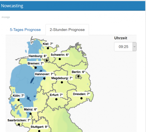 Eine Kaltfront zieht heute mit Wind und Regen über Deutschland hinweg. Im Nowcasting lässt sich der Weg der Front nachzeichnen. Mit unserer Radarprognosefunktion wird die Entwicklung bis zu 2 Stunden in Zukunft vorprognostiziert.