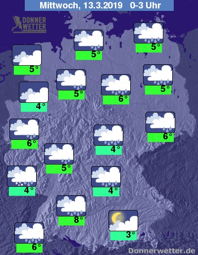 In der Nacht zeigt sich der Himmel zunächst noch vielerorts bedeckt und verbreitet fällt Regen, der vor allem im Süden und Osten auch kräftiger ausfallen können. Im Südwesten können sich auch örtliche Schneeregen- oder Schneeschauer mit einmischen. Die Schneefallgrenze sinkt in der Nacht auf 400 bis 600 m.