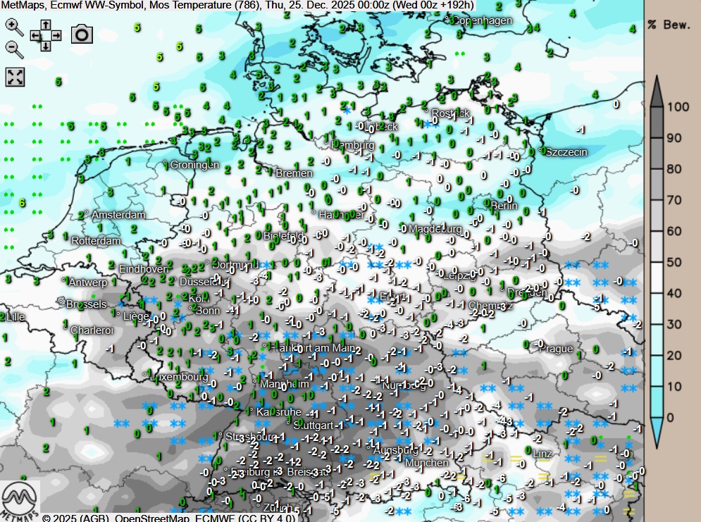 Nach den neuesten ICON-Berechnungen bewegen sich die Temperaturen am 24.12 dann vielerorts nur noch bei Werten zwischen 1 und 5 Grad, in höheren Lagen stellt sich ab etwa 500 Metern Frost ein. Da es sich um trockene Festlandsluft handelt, stehen die Chacen auf Schnee vor allem in den Niederungen aber weiterhin schlecht.