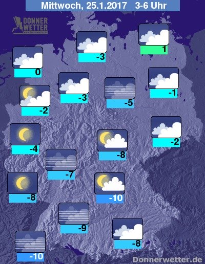 In der bevorstehenden Nacht klart der Himmel über dem Westen und Süden Deutschlands verbreitet auf, vor allem am Alpenrand ist es aber auch oft stark bewölkt oder neblig-trüb, dazu jedoch trocken. Zum Großteil stark bewölkt bleibt es über der Nordosthälfte des Landes, dabei fällt aber nur ganz vereinzelt etwas Schnee. Die Temperatur sinkt auf 1 Grad in Rostock und bis auf -10 Grad in Konstanz am Bodensee.